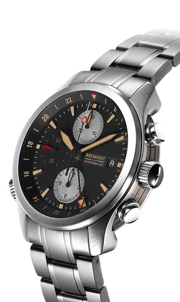 Hardened stainless steel Bremont Trip-Tick® construction with scratch resistant DLC treated case barrel. Case diameter 43mm, lug width 22mm, case thickness 16mm. Patented inner bi-directional Roto-Click® bezel. Operated by crown at 8H.