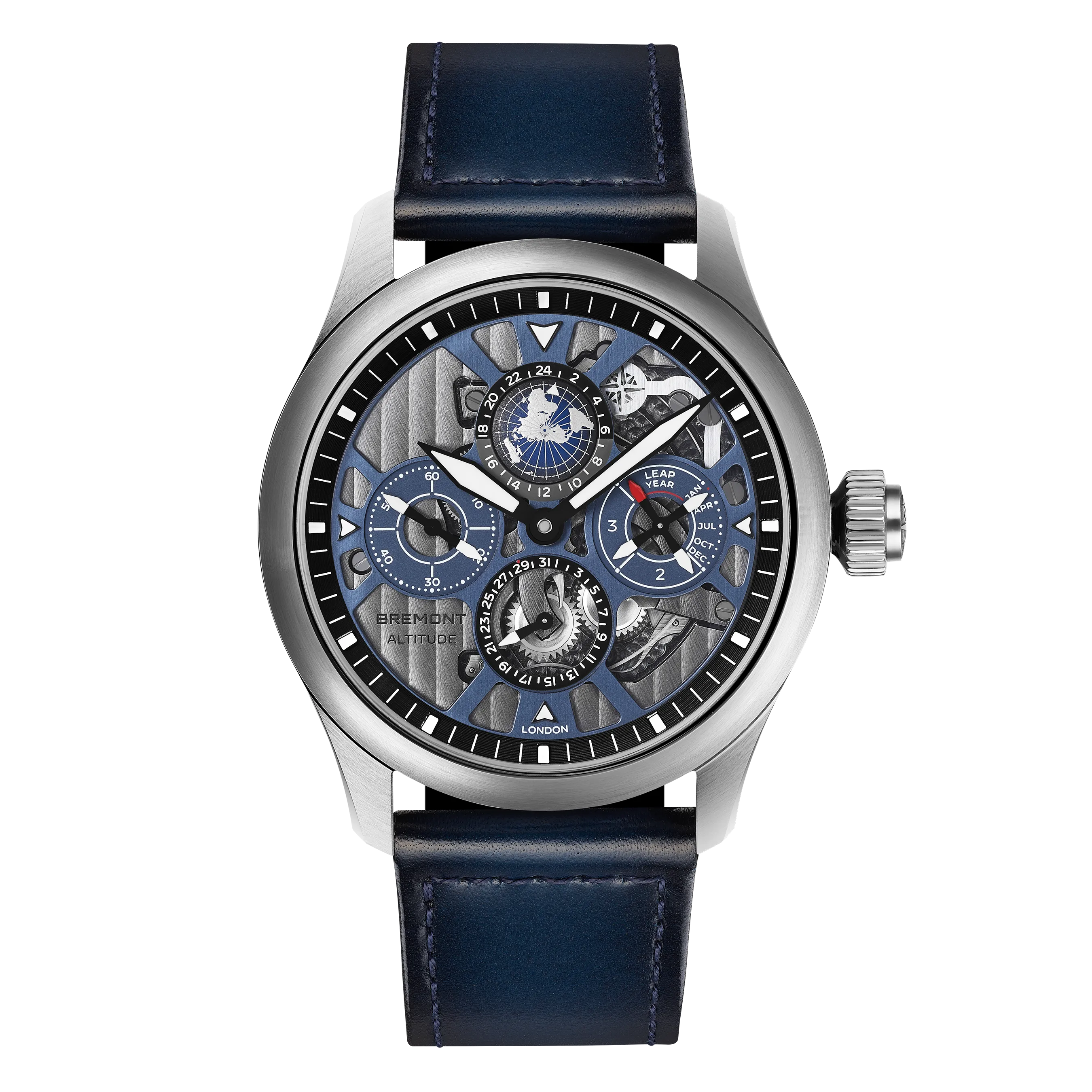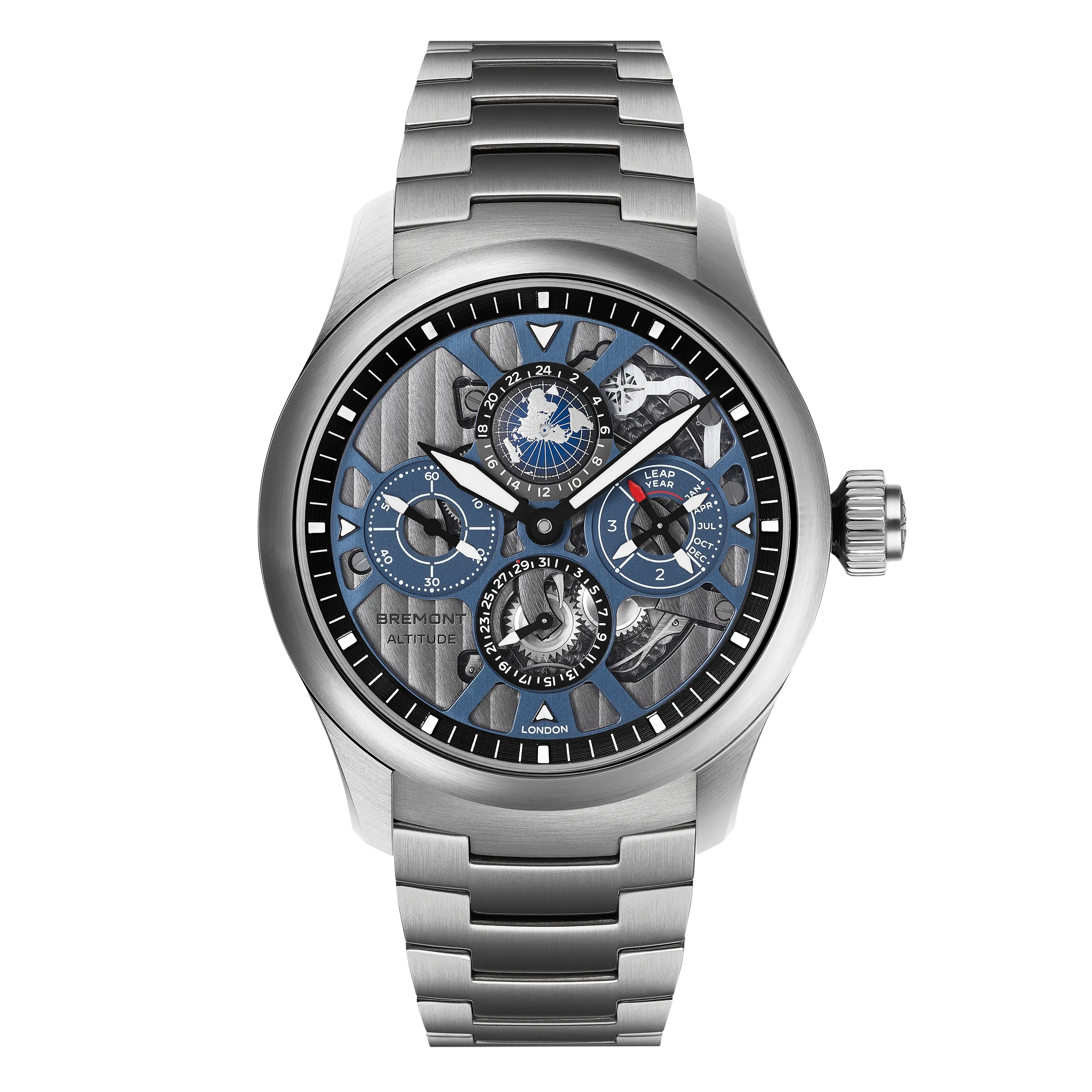 Crafted to deliver enduring performance and refined precision, the Altitude Perpetual Calendar GMT is finished with a glassbox sapphire crystal and is offered on both a titanium bracelet and patinated blue leather strap. A showcase of British design, Swiss horological mastery and high complication craftsmanship — built for those who appreciate the rare and exceptional.